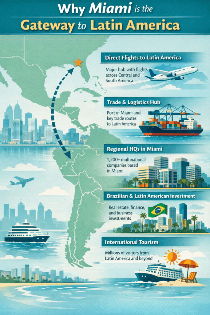 Miami’s rise as an international business hub is partly geographic. Located at the southern edge of the United States, the city sits closer to many Latin American capitals than to major American business centers such as New York or Chicago.